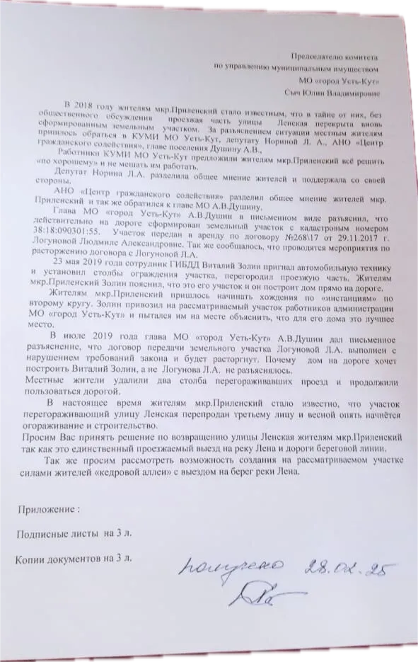 Это эпопея началась на излете правления городом Владимиром Кроивоносенко, который по неизвестной, но судя по всему очень веской материальной причине, без торгов и публичного объявления, передал в аренду на 20 лет земельный участок в микрорайоне Закута, бывшему сотруднику ГАИ Виталию Золину. При этом наплевав на остальных жителей этой части микрорайона, расположенного на месте бывшего Придонского ЛПХ. Ведь именно на месте сформированного земучастка с кадастровым номером 38:18:090301:55, располагался единственный в округе съезд к реке Лена, которым пользовались все жители.